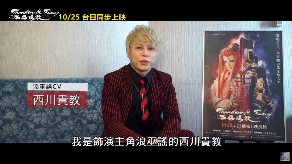 雖然這並不是西川貴教第一次配音,但在身為主角台詞量又暴增的情況下,他表示這次的配音工作相當困難,而且加上他要飾演的是不同時期的浪巫謠,聲線與情感上自然有更多的發揮。西川貴教最後也不忘呼籲喜歡浪巫謠的粉絲們一定要進戲院觀賞這部作品。