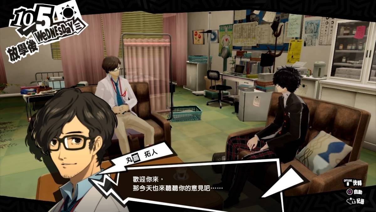 在 P5 當中,原本只有隨著主線發展自動進展關係的明志吾郎,到了 P5R 當中,和其他關鍵角色一樣,可以有下課後的互動(約會)了!