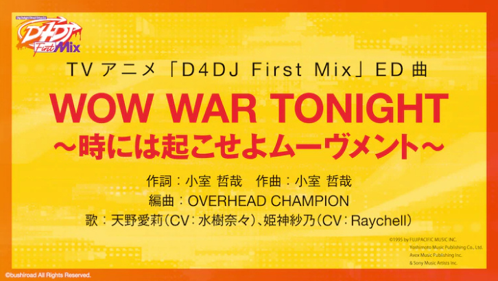 動畫片尾曲在今天的試映會中首次批露,由水樹奈奈、Raychell 兩人翻唱濱田雅功、小室哲哉組成的 H Jungle with t 於 1995 年發行的「WOW WAR TONIGHT ~時には起こせよムーヴメント~」。Reychell 表示小時候就聽過這首歌,沒想到會由自己和水樹奈奈一同翻唱,既驚喜又開心。