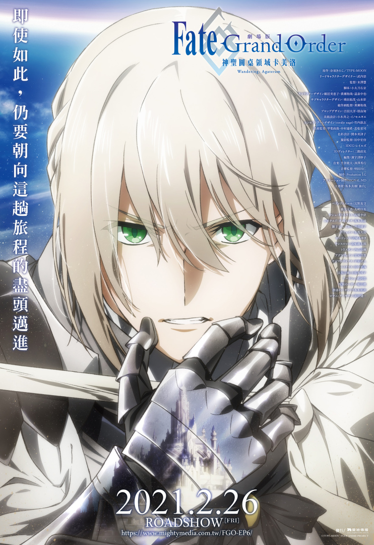 全球知名電玩《Fate/stay night》為慶祝發行十週年,推出衍生手機遊戲《Fate/Grand Order》,這款繼承《Fate》基本設定概念,進而延伸出全新劇情與架構的手遊,自 2015 年首度上線後,迅速累積超高知名度及大量玩家,全世界玩家下載次數更突破了 5000 萬。《Fate/Grand Order》自 2019 年啟動影像計劃,繼電視動畫《Fate/Grand Order-絕對魔獸戰線巴比倫尼亞》後,再推出劇場版《Fate/Grand Order-神聖圓桌領域卡美洛》,電影將以前後篇的形式上映,由聲優王子宮野真守擔綱電影主要角色「貝德維爾」配音,台灣繼日本之後將安排於 2021 年 2 月 26 日上映前篇〈Wandering; Agateram〉。