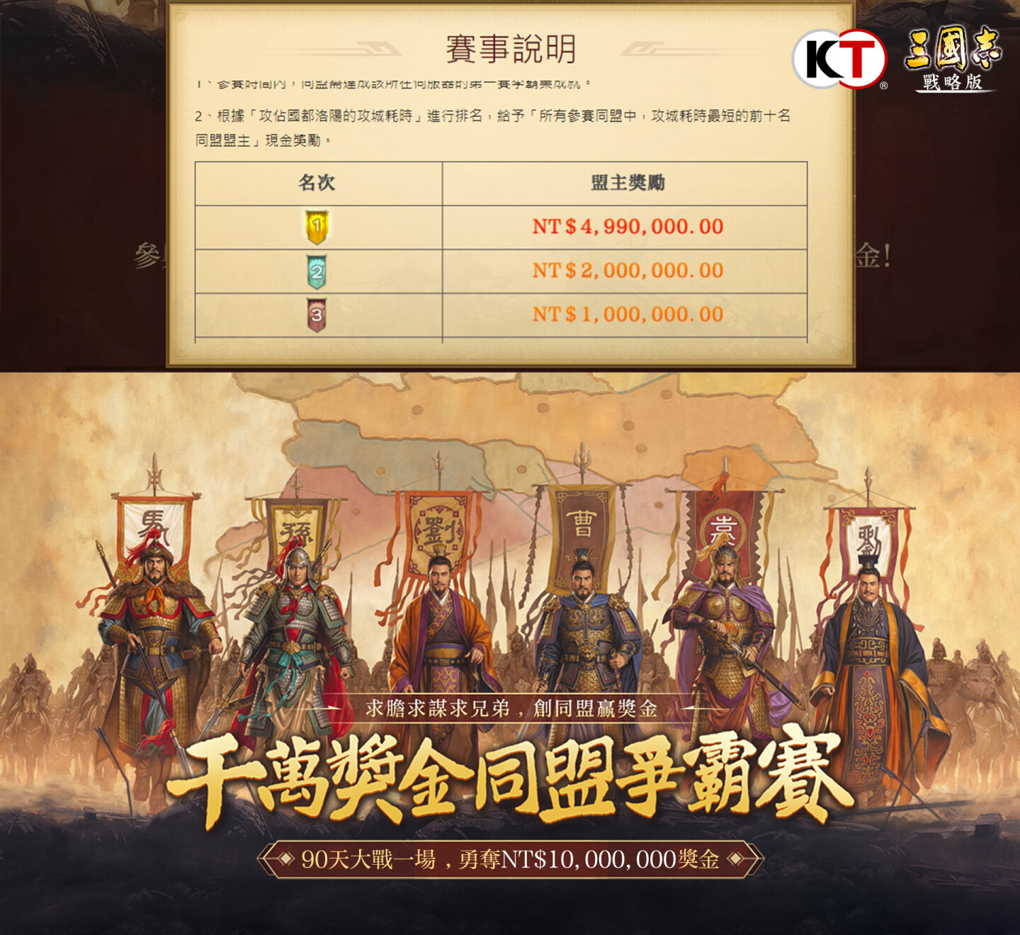 更多關於遊戲玩法,以及「千萬獎金同盟爭霸賽」的各項細節資訊,玩家們敬請密切關注遊戲官方粉絲團內相關最新情報;請務必把握良機加入《三國志・戰略版》的高額獎金賽事,總獎金一千萬新台幣將由那十大同盟共同競逐,即將成為策略遊戲界的年度盛事。