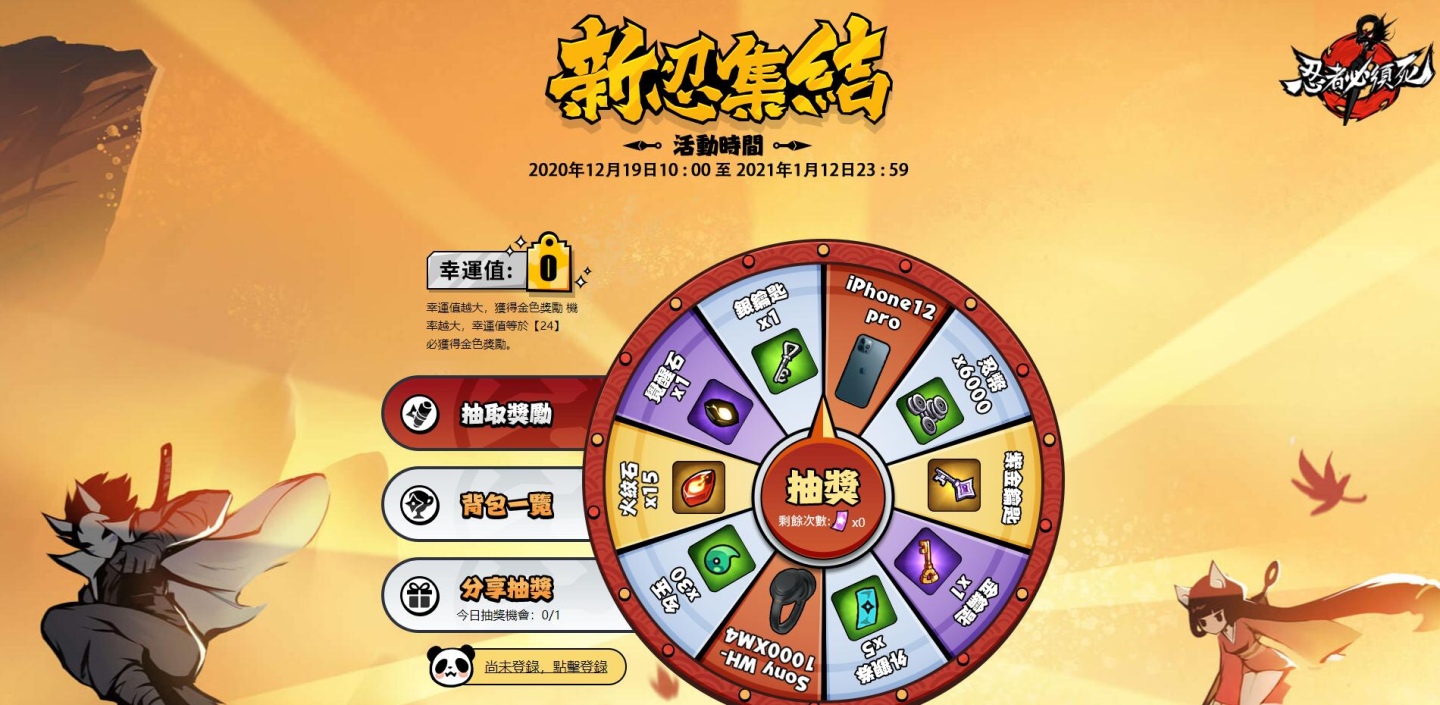 《忍者必須死》官方表示,為感謝廣大玩家對遊戲的喜愛和支持,加碼開放事前登錄的第二波福利活動。每日參與抽獎即有機會獲得豐富遊戲獎勵,其中大獎包含 iPhone12 pro!