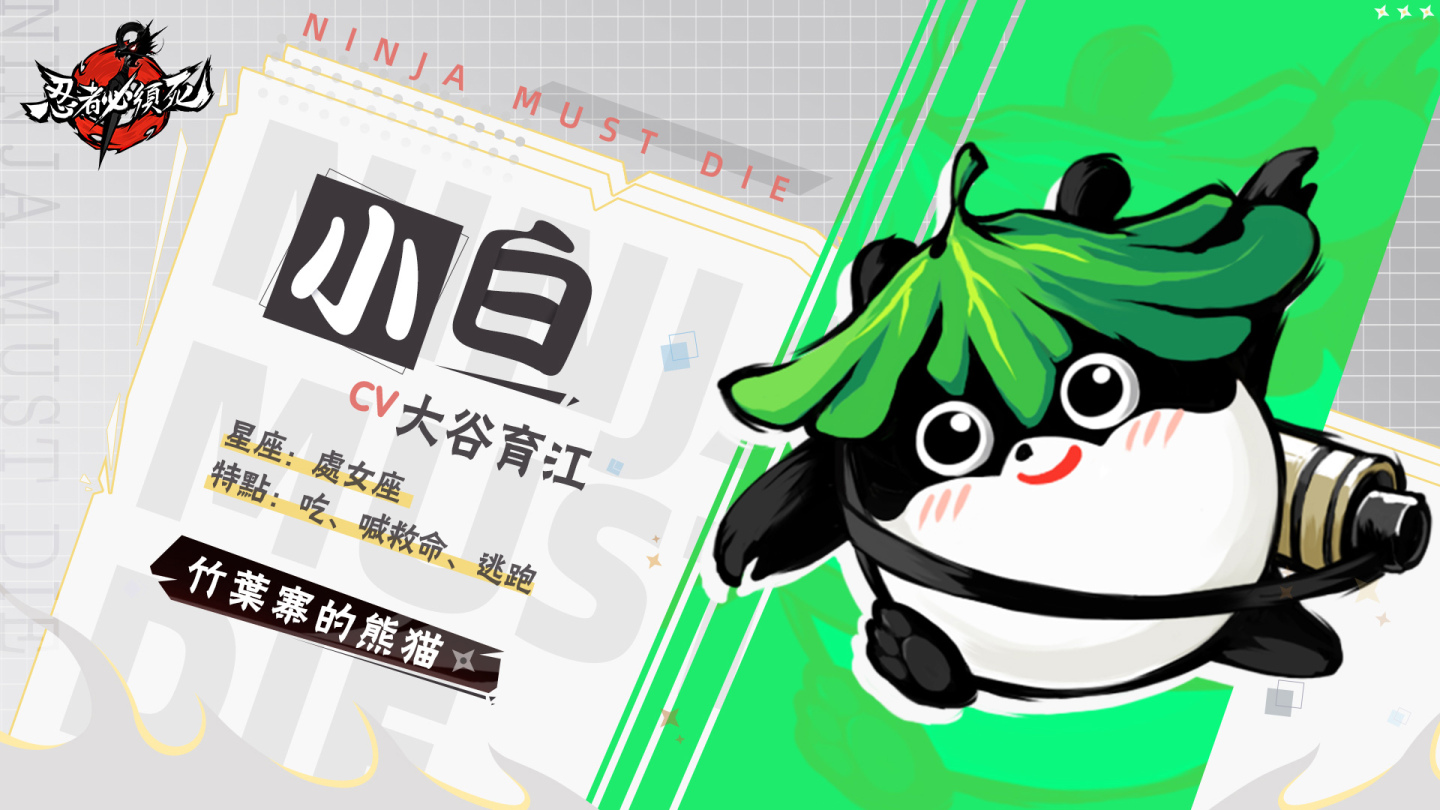 熊貓小白,是《忍者必須死》的團寵。官方特地邀請到了吉祥物專業戶—喬巴、皮卡丘的聲優大谷育江老師來詮釋。那元氣可愛的少年音,使小白可愛又頑皮的形象躍然紙上。