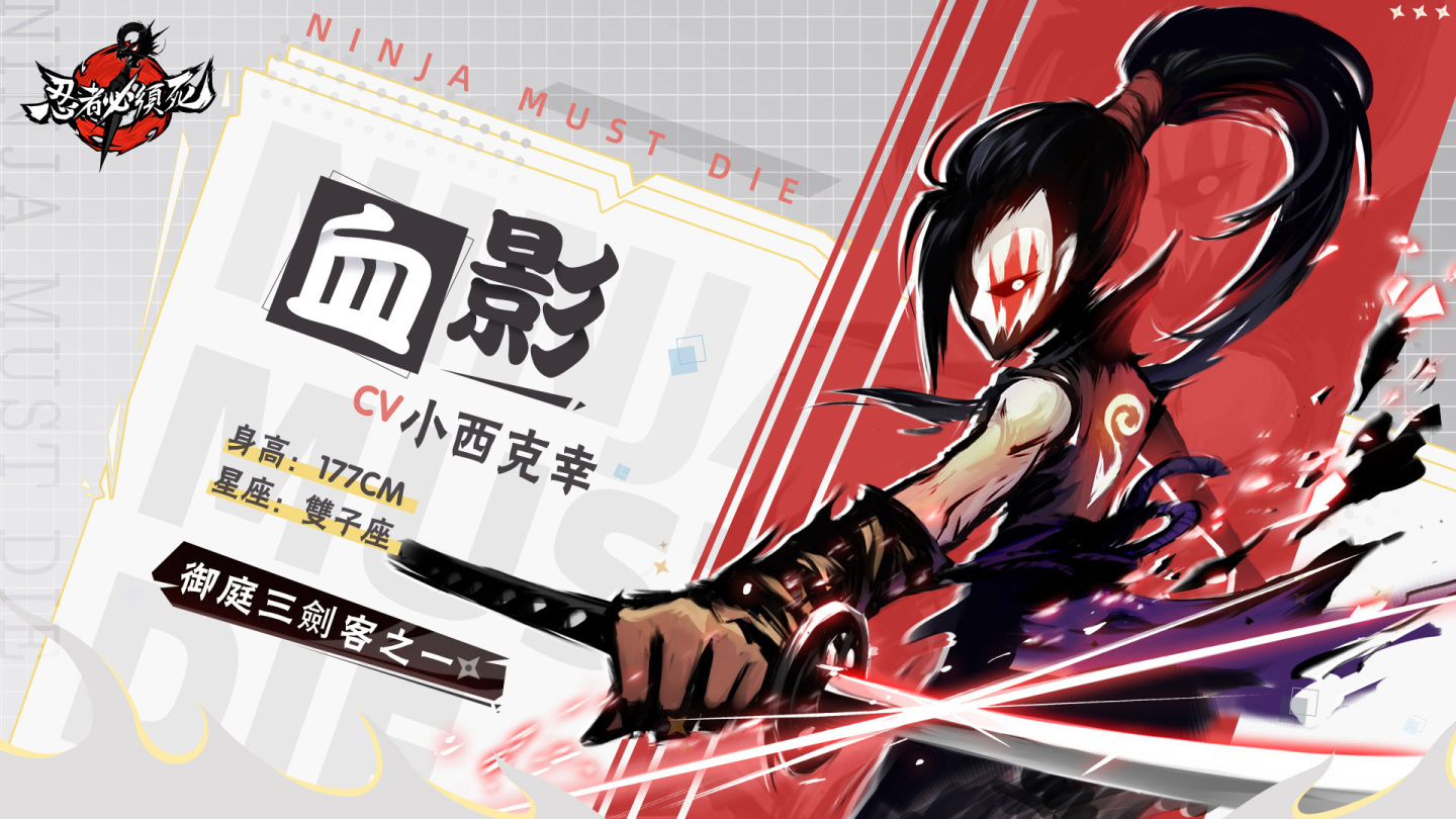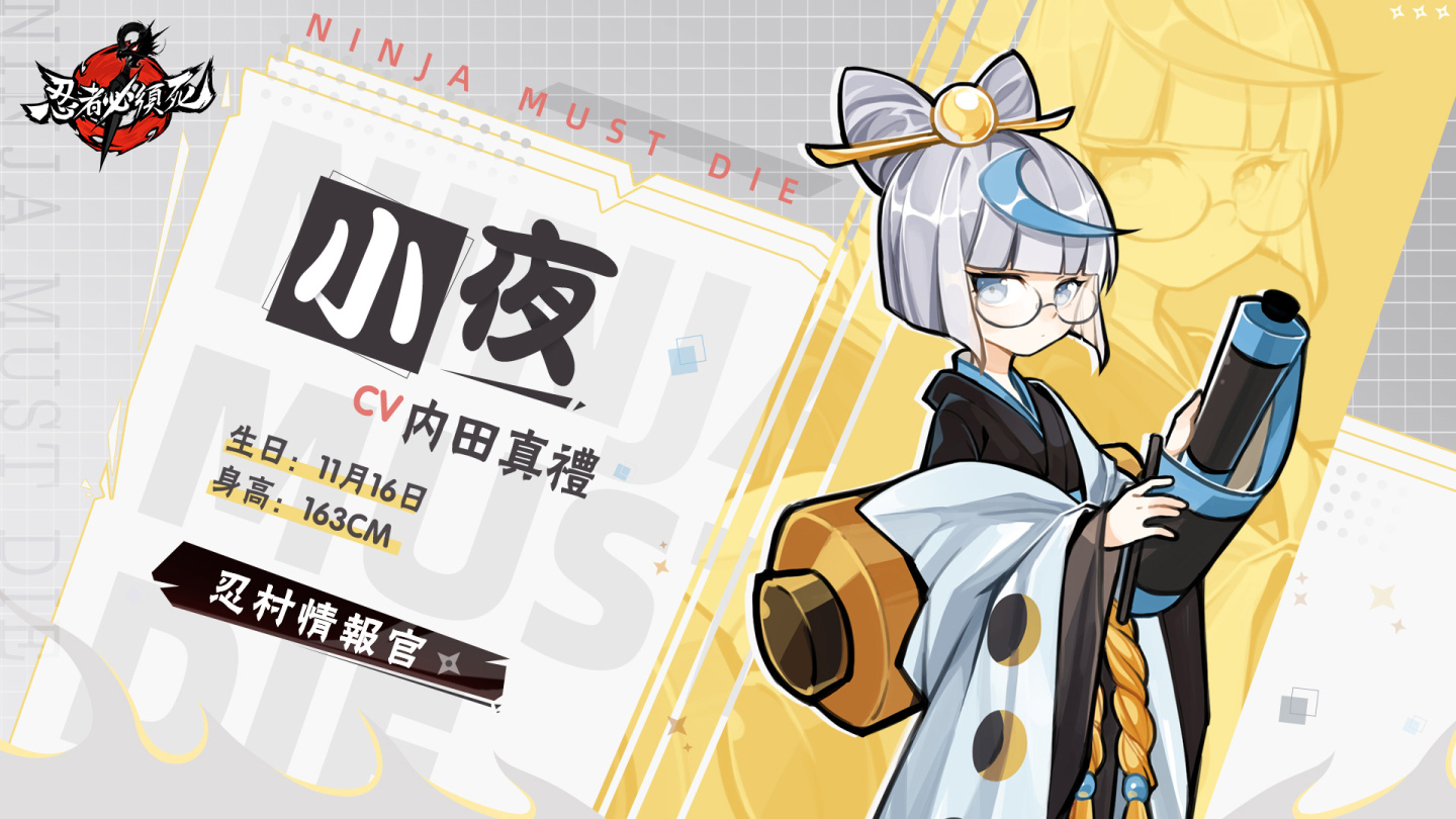 CV:小西克幸(代表作:《世界一初戀》高野政宗、《惡魔奶爸》男鹿辰巳)除此之外,知名聲優前野智昭將飾演遊戲中的大反派「陰陽師」、關智一擔任忍者考核的「考官」、銀髮眼鏡娘「小夜」由內田真禮擔綱獻聲以及神秘又性感的「老闆娘」則由早見沙織詮釋,多位日本人氣聲優皆為《忍者必須死》獻聲演出。