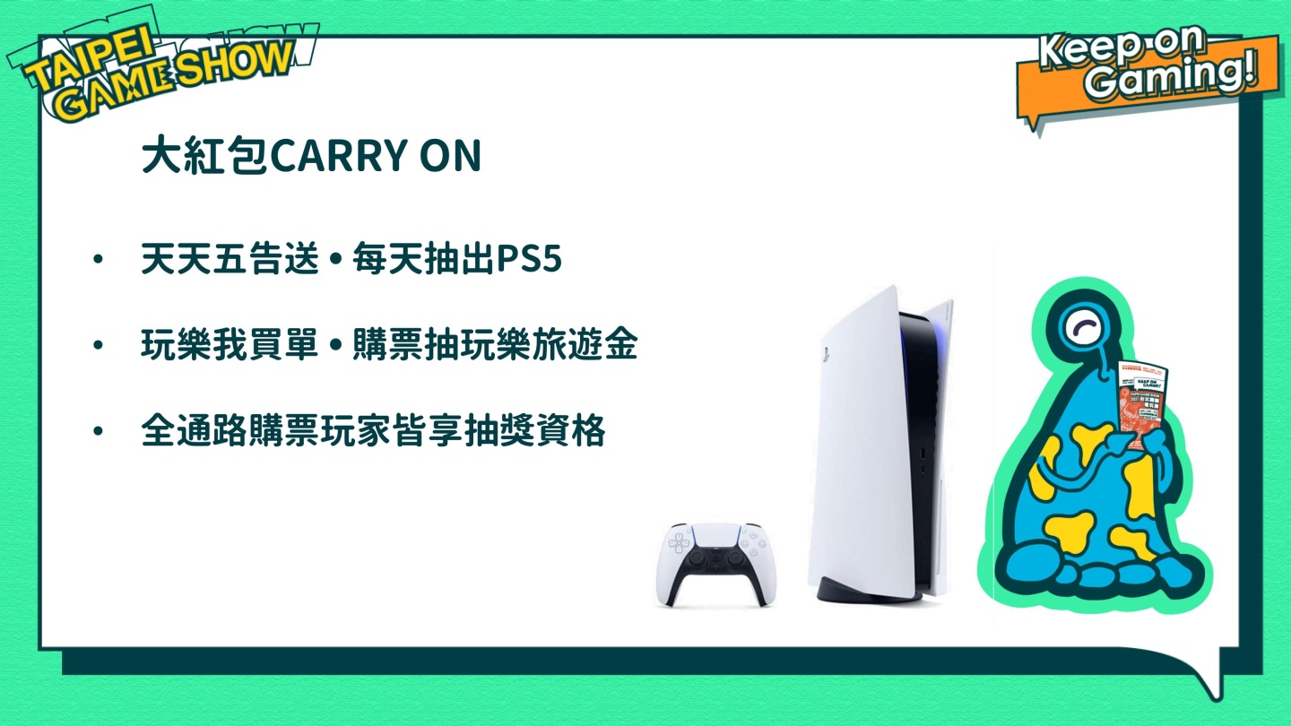 預購票日前已於合作通路全面開賣,除優惠價 200 元的單日票外,限定通路販售「獨家限量徽章套票(7-11全台門市/共2,000組售完為止)」、「超值一日/四日套票周邊組(蝦皮商城/共810組售完為止)」。此外為了提供中南部玩家更便利的服務,首度攜手與台灣高鐵、大樂國際旅行社合作,推出「電玩展門票X往返車票」貼心組合,北至桃園、南及高雄,展期間天天出發,除票價及車票有特殊優惠外,還可獲得玩家專屬進場排隊資格以及參加遊戲主機抽獎。同時為回饋玩家支持,展覽規劃「大紅包CARRY ON」活動,使用官方公告之通路預購門票或現場臨櫃購票,憑展覽期間票根,可參加「天天五告送」及「玩樂我買單」活動,展期間每日於現場抽出一台 PlayStation 5及價值約 8,000 元的吃喝玩樂旅遊金等超值大獎。