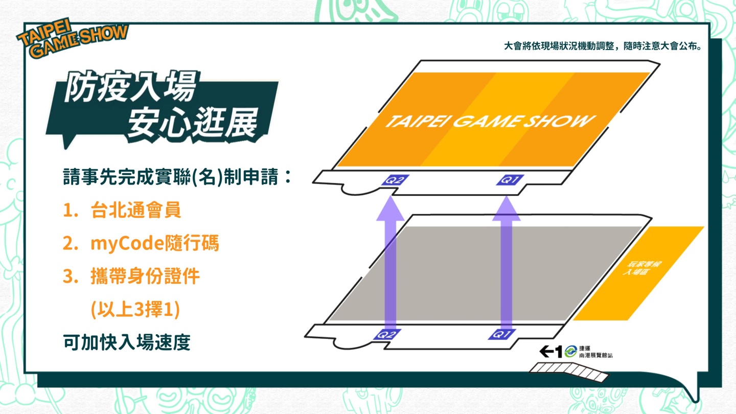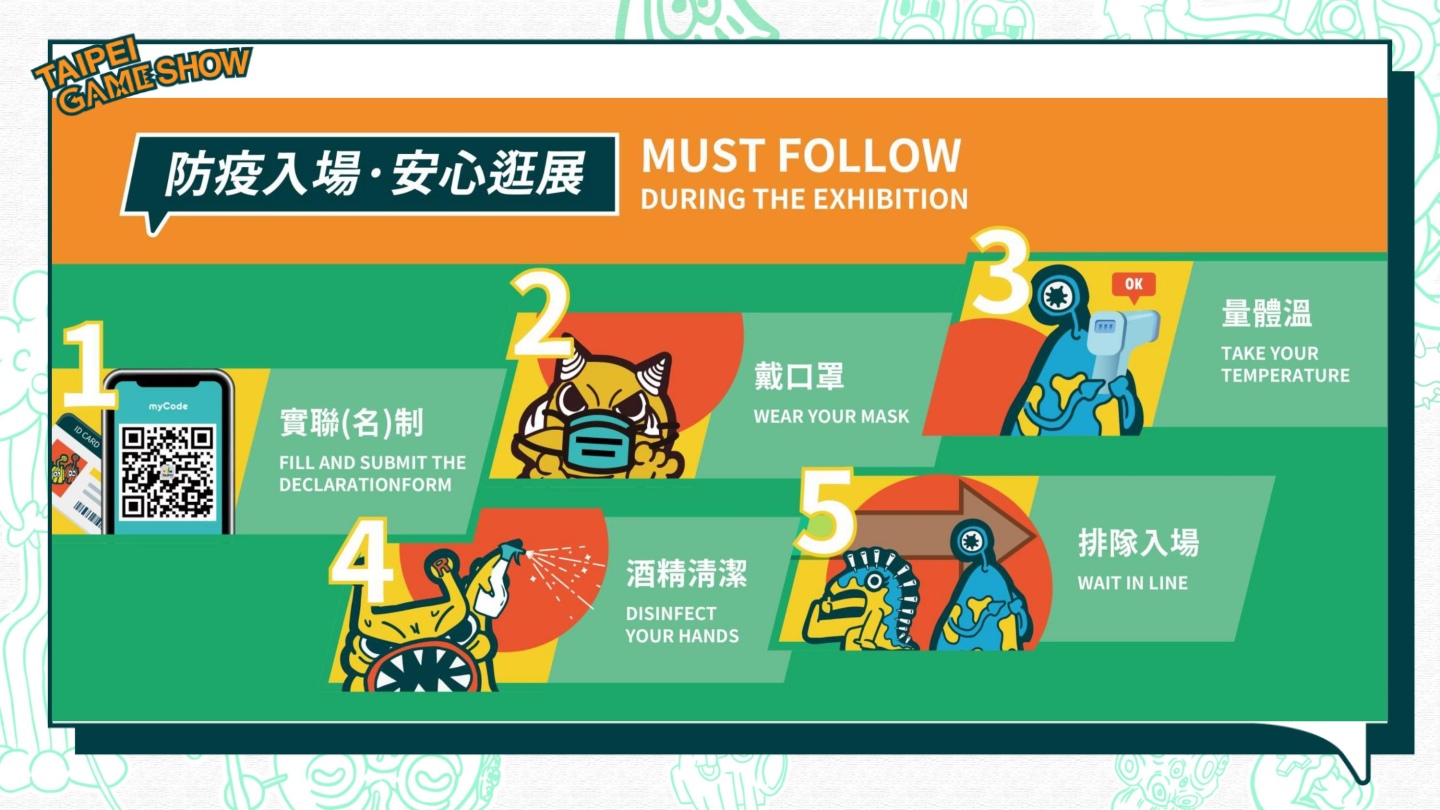 台北市電腦公會表示,展期間人口管制將以保持會場空氣流通為準則實行,而在展覽廠商方面經過溝通協調,將配合擴大舞台活動腹地確保足夠距離,同時也會將加派工作人員進場宣導。對於因應防疫展覽措施的相關實行細則,將會後續在官方粉絲專頁公開玩家關心的防疫流程所需時間,以及各項動線措施宣導。