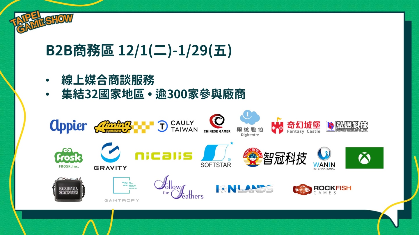 線下方面「B2B商務區」受疫情邊境封鎖影響,現場以國內業者為主,海外遊戲業者,皆以線上形式參展。截至目前已有 32 個國家地區、超過 300 家業者參與線上商談,更將有 50 款以上的遊戲台灣獨立遊戲作品將首次發表。獨立遊戲大獎 Indie Game Award 更將在 28 日公開得獎作品與團隊。