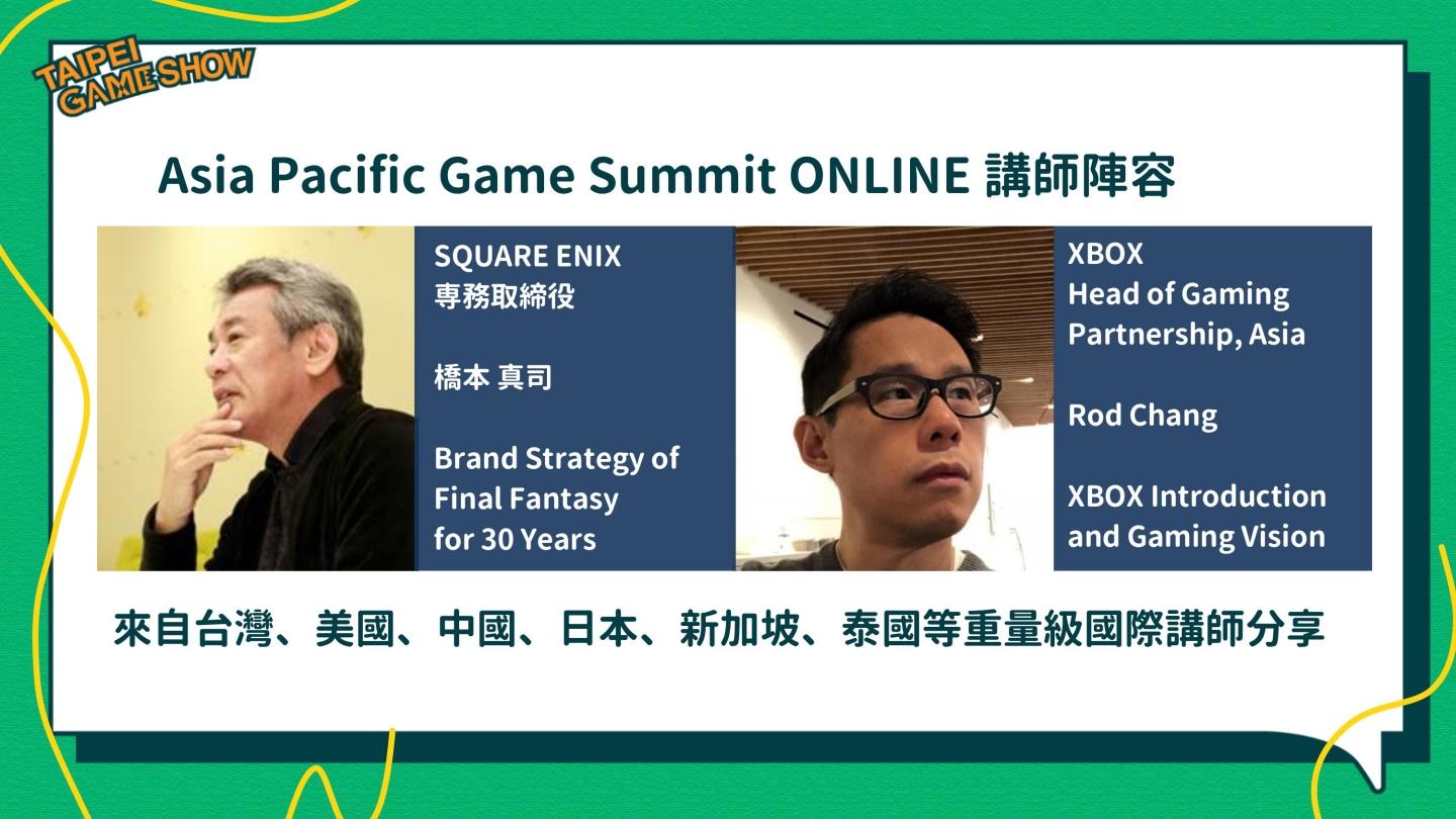 APGS 亞太遊戲高峰會將採全線上方式進行,兩天規劃 10 場線上演講,其中包含 SQUARE ENIX專務取締役橋本真司暢談過去 30 年 Final Fantasy 的品牌塑造歷程及微軟 XBOX 遊戲亞洲區負責人Rod Chang 分享開發者如何與 XBOX 合作及未來的遊戲願景,還有來自全球的獨立開發者透過 Taipei Game Show 官方YouTube 頻道播出,全程提供中英文雙語字幕。