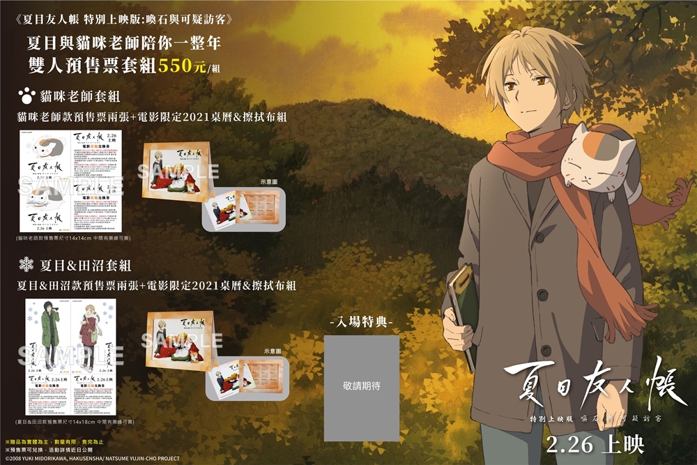 《夏目友人帳特別上映版-喚石與可疑訪客》電影預售雙人套票年曆組內,均含電影交換券兩張及電影限定 2021 桌曆 & 擦拭布組乙組,每組售價 550 元。粉絲可以統包「貓咪老師」與「夏目&田沼」兩款,還能把桌曆珍藏在桌面或相框內,輕巧的質感擦拭布也精心呈現電影主角「夏目」與「貓咪老師」在暖爐裡分享美食的限定圖,即使是寒冷的二月天也能感受到溫暖。兩款預售套票組 1/15 起於木棉花購物網、博客來售票網、金石堂售票網、台灣安利美特網路線上商店、買動漫售票網均可選購。為了與粉絲同樂,2021 台北動漫節「木棉花服務台」現場也可以購買,讓暖男主角與療癒貓咪陪你一整年,後續也將提出入場特典企劃,粉絲們敬請期待!(如有異動,以木棉花 FB 官方粉絲專頁公告為準)