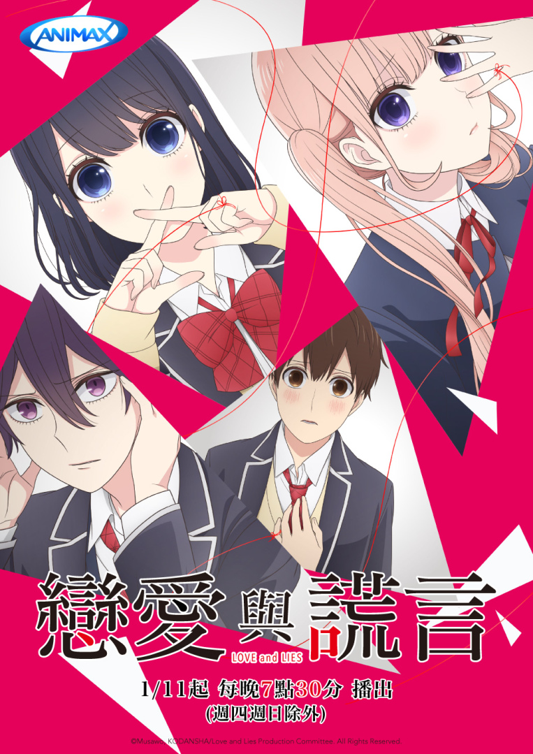 1/11 (一) 起,每晚 7 點 30 分(週四週日除外),由《戀愛與謊言》開啟「ANIMAX 戀愛大作戰」的第一槍,渴望自由戀愛的男女們追求真愛禁忌的戀愛物語,「謊言」不被允許,「戀愛」更是禁忌。日本在「超少子化對策基本法」下,所有人一到十六歲時便會接到來自政府的結婚對象通知。本作主角根島由佳吏在十六歲生日前夜,終於下定決心要將自己埋藏多年心意傳達給自己的心上人。但就在同一時間,政府已經幫他配對好了,透過科學的紅線結合的對象竟是真田莉莉奈。