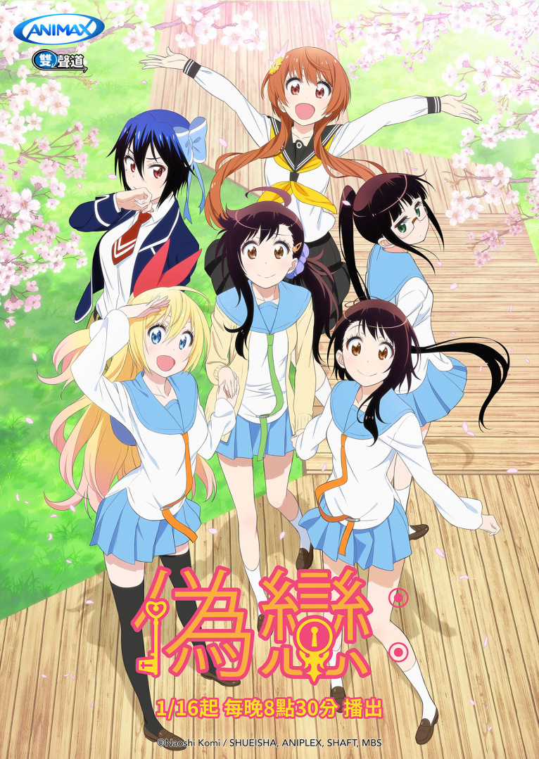 在 1/16 (六) 晚間 8 點 30 分為大家獻上超人氣動畫《偽戀 第 2 期》,黑道「集英組」的唯一繼承人,同時也是現役高中生的男主角一條樂,十年前與成為朋友的女孩約定如果再次相遇就結婚!從那時起,他便隨身帶著那約定之物 …「鎖」。某日,樂的班上來了位美少女轉學生桐崎千棘,而她的真實身分是美國黑幫大小姐。水火不容的兩人,為了讓雙方家族的幫派能夠和平相處,被迫假裝成一對戀人?然而樂真正喜歡的,是身為同班同學的小野寺小咲,與現實妥協的虛假的愛情故事,即將展開!