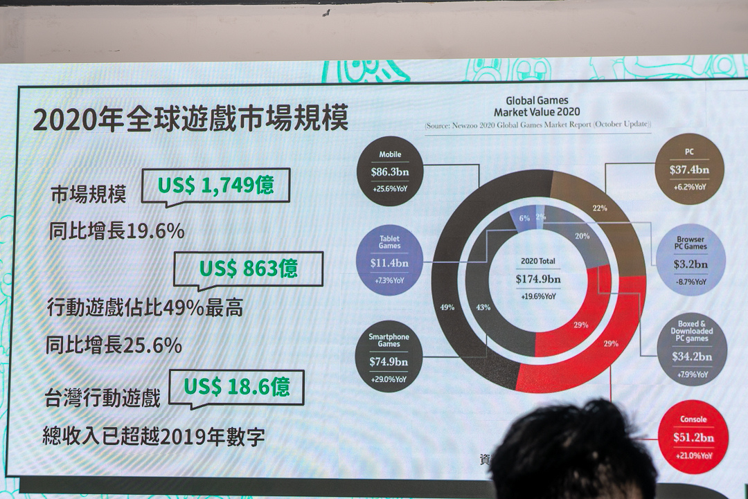 在今天活動一開始,官方先針對目前市場進行說明。2020 年全球遊戲市場規模 1,749 億美金,比前年同期增長 19.6%;其中行動遊戲佔比 49%最高(約 863 億美金),比去年同期增長 25.6%。而台灣行動遊戲市場高達 18.6 億美金,總收入已超越 2019 年數字。