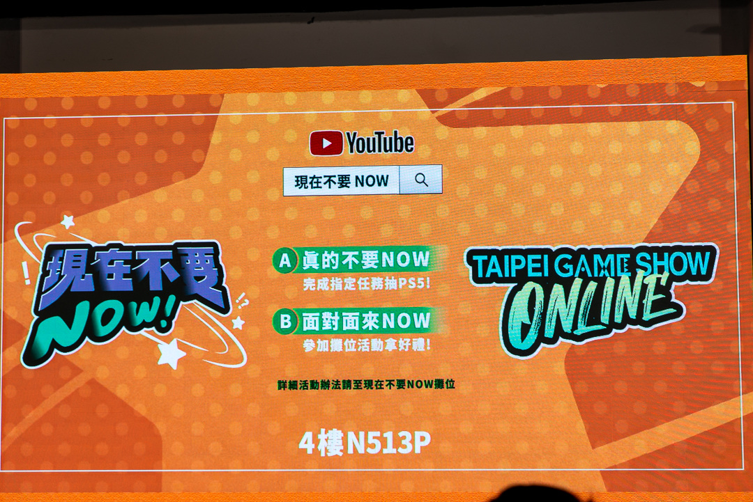展出期間「Taipei Game Show Online」線上直播節目將於 1 月 29 日至 31 日連續三天上午 10:00 至下午 17:00,在官方唯一指定影音合作 YouTube 頻道「現在不要NOW」播出,現場直播棚將帶來 20 場直播節目,遊戲製作人訪談、KOL 遊戲試玩與線上互動體驗等精彩節目內容。此外,玩家至活動攤位上完成指定任務,還可獲得限量好禮及參加 PS5 抽獎活動。詳細節目內容將公告在 TGS 官方網站。