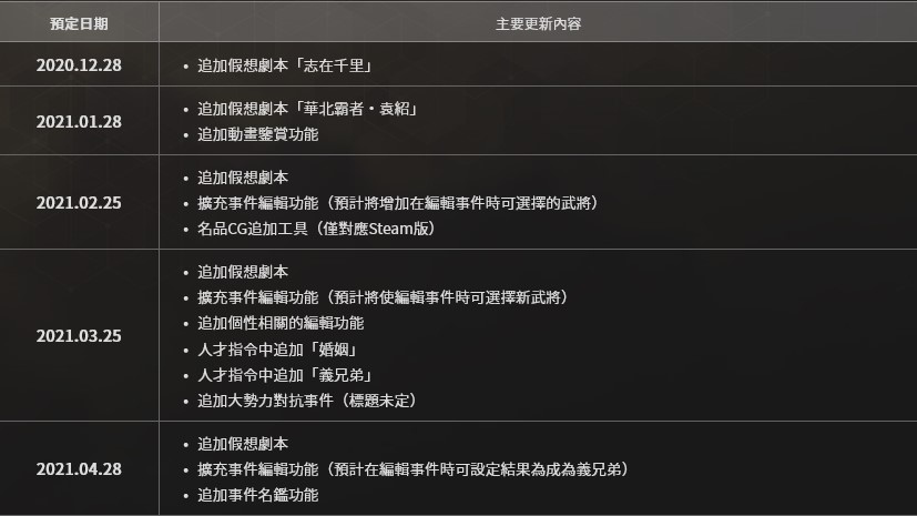 現正公開《三國志 14 威力加強版》直到今年 4 月為止的免費更新內容,除了每月追加假想劇本及事件編輯功能的擴張之外,也將有可以設定個性相關編輯功能,以及可以在遊戲中設定婚姻及義兄弟等之功能,敬請持續享受擴張機能後,遊戲性更加深化的遊戲樂趣。