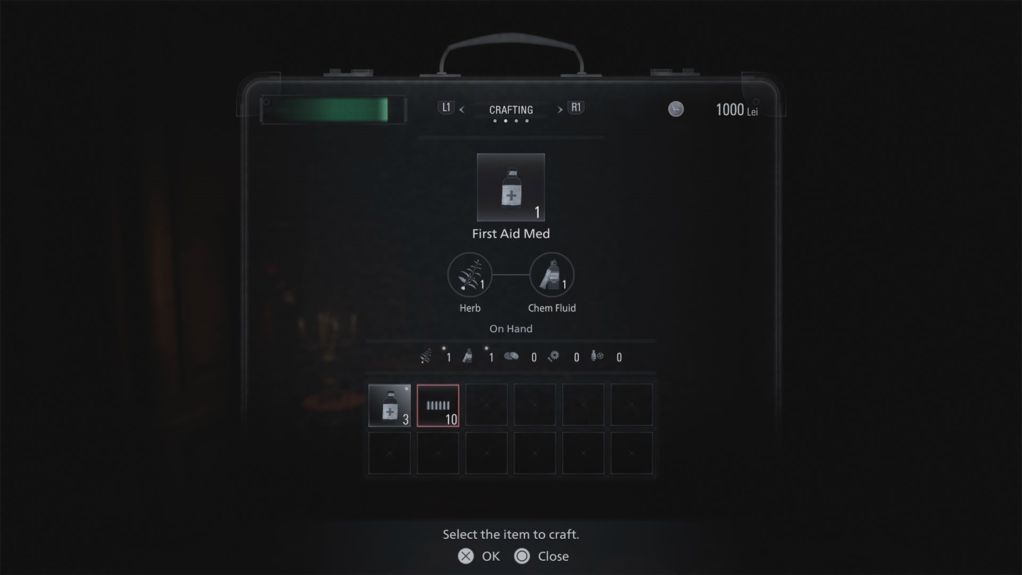 道具管理 由於伊森在遊戲中能攜帶的武器與道具數量有限,因此要如何選擇隨身攜帶的武器道具,就是玩家攻略時的重要考量要點之一。而在本作,也依然會將系列玩家們所熟悉,可以將藥草與藥水加工成回復藥等道具的製作調合系統再度收錄。玩家們透過關卡故事進行還可以取得各式各樣的合成表,藉此來製作出各種消費道具使用。
