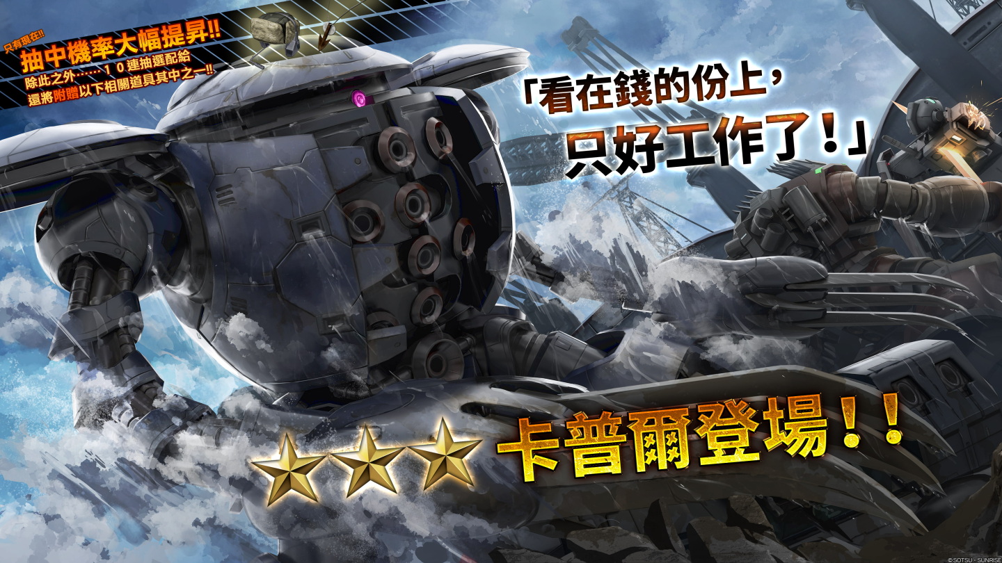 這週將登場新機體「★★★卡普爾」!第一次新吉翁戰爭時,哈曼率領的阿克西斯為了侵略地球所開發的水陸兩用MS「卡普爾」!搭載多種內藏式武器,更以威力強大的鐵爪發動格鬥攻擊愚弄敵人!※可能未經告知變更・結束。