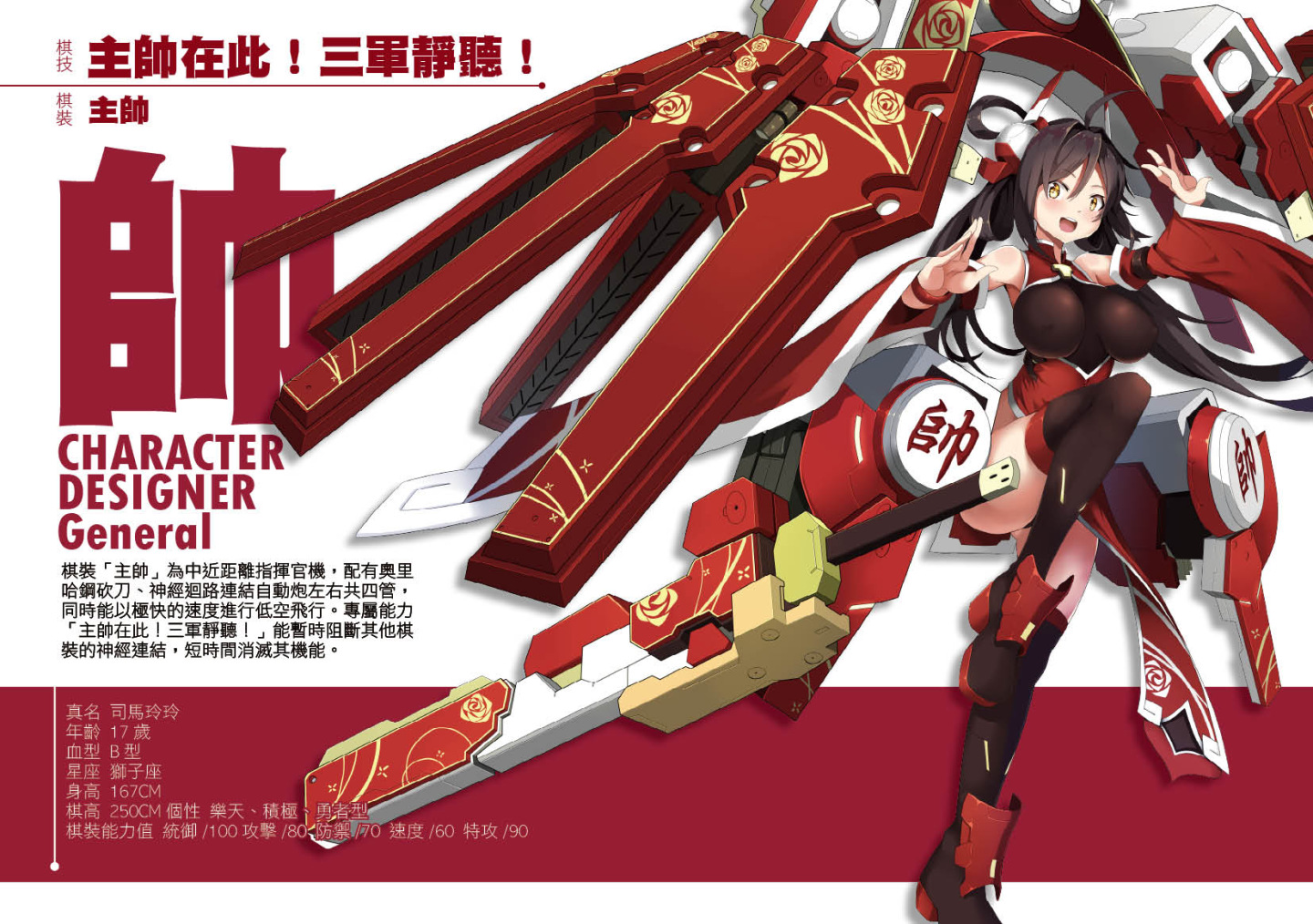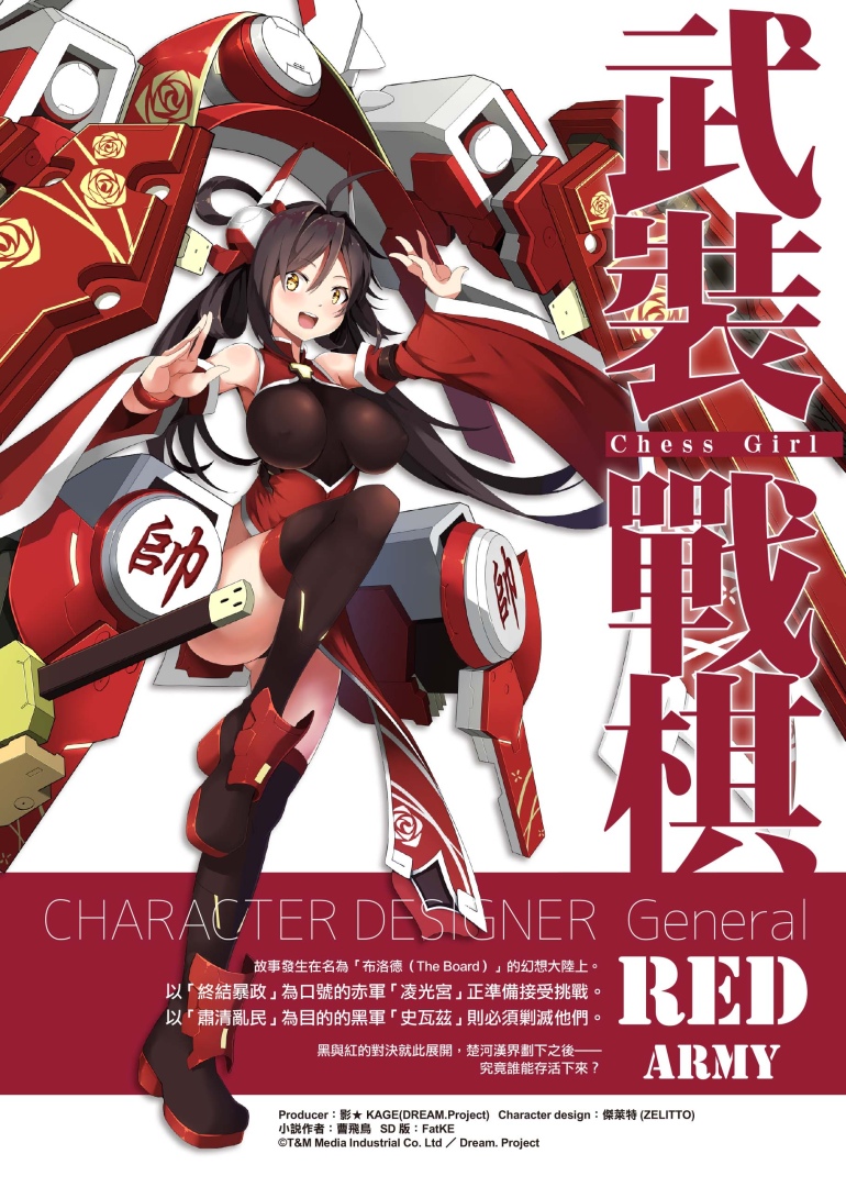 「提恩傳媒」出品,「駿文化創意(DREAM.Project)」原案製作,中國傳統對弈遊戲「象棋」所衍生出的台灣原創作品《武裝戰棋 Chess Girl》,將象棋中各種不同能力的棋子「帥」、「仕」、「相」、「砲」、「俥」、「傌」、「兵」以武裝少女的形式呈現,是繼大人氣的船艦擬人後,另一種型式的裝甲+少女的設計,這次是以「赤軍 (凌光宮)」為主線挑戰「黑軍 (史瓦茲)」,由「和棋系統」所製造出來的棋裝少女運用各自的棋技,於幻想大陸「The Board (布洛德)」展開炙熱的戰鬥故事。