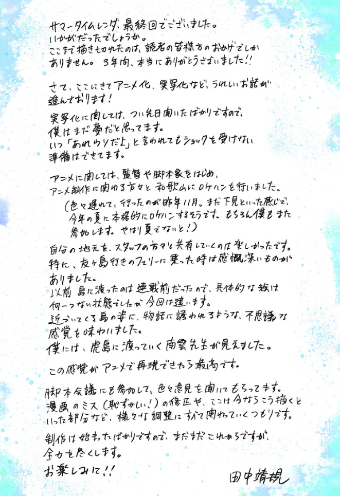 《夏日時光》描述少年慎平因為青梅竹馬‧潮的過世,而回到暌違兩年未踏上、住著約 700 位居民的離島和歌山縣「日都島」,在參加潮的葬禮的過程中,慎平捲進島上異變所引起的奇怪事件中......。今天還公開了作者田中靖規老師的感言及為了動畫化與製作組親自到和歌山縣取材相關的話題。實境逃脫遊戲也預計將在今年夏天於和歌山縣的友島舉行,完結篇單行本 13 集將在今年 4/2 在日發行。
