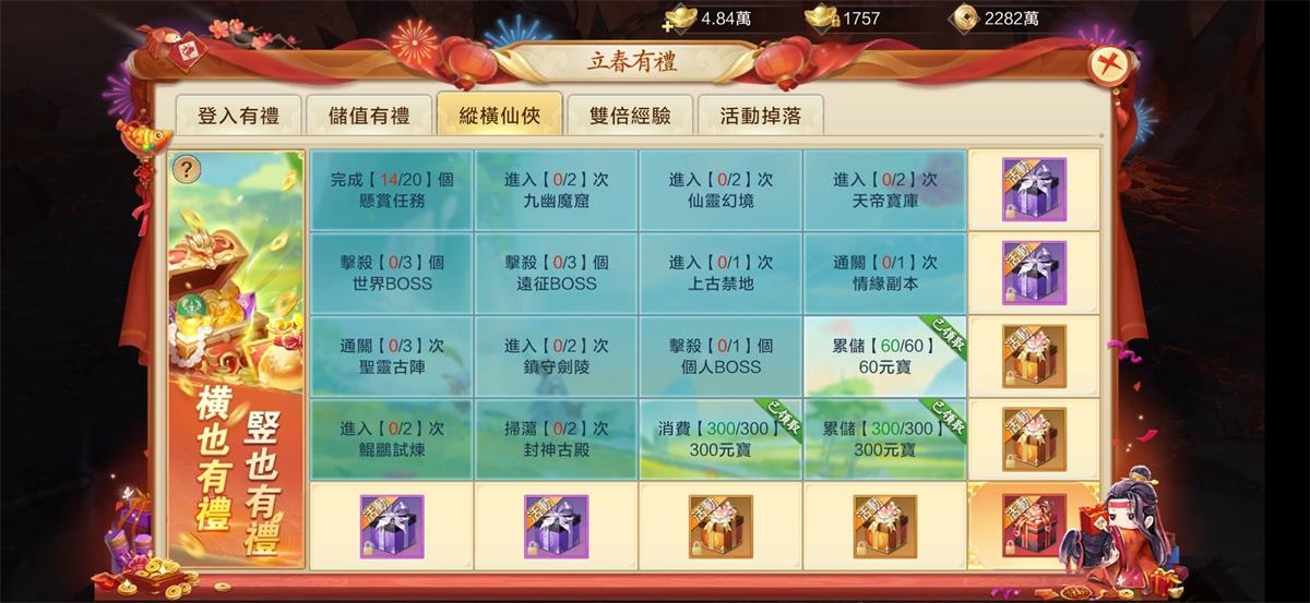2 月 3 日遊戲內將舉辦豐富的「立春有禮」活動,開服時間 15 天以上的伺服器所在玩家,在活動當天登入遊戲即可獲得豐厚的虛寶,參與活動還可獲得雙倍經驗、仙盟紅包等眾多活動獎勵,此外官方還將在活動中釋出限定外觀「金風玉露」、「轉職卡」,更多福利活動請關注官方粉絲專頁及後續新聞資訊。