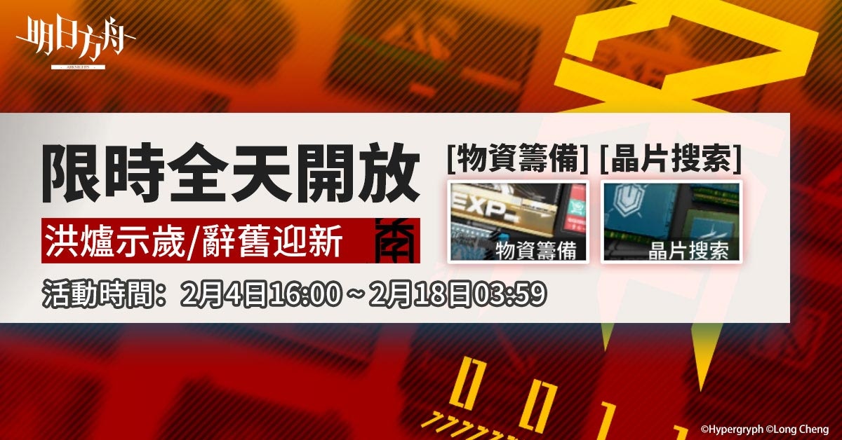活動期間「物資籌備」及「晶片搜索」內所有關卡全數開放,不受開啟時間限制,玩家可自由選擇關卡進行挑戰,獲取需要的各種物資。
