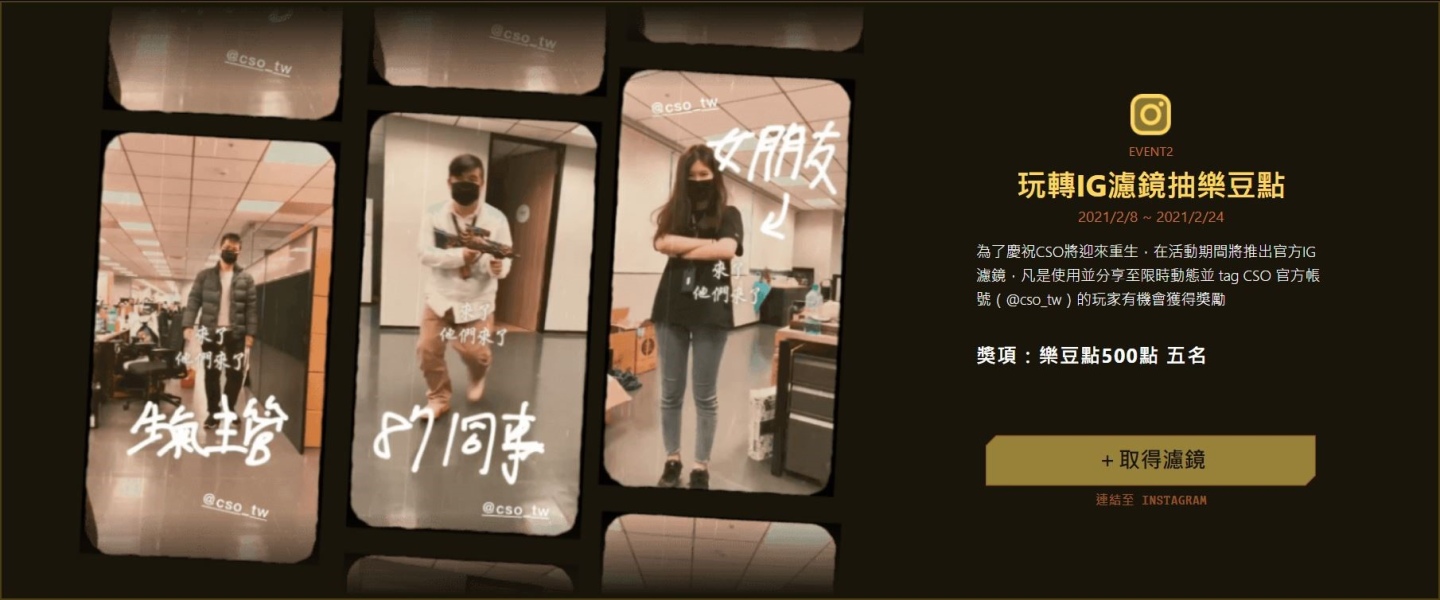 伴隨改版,結合經典的殭屍、武器等元素的全新形象網頁也正式上線;同時,為了多方面的融入玩家生活,官方更特地用CSO經典台詞製作專屬的IG濾鏡!只要在IG搜尋@cso_tw即可在濾鏡版面點擊使用,使用濾鏡並tag @cso_tw,還能抽500樂豆點!活動詳情,請見官方公告。