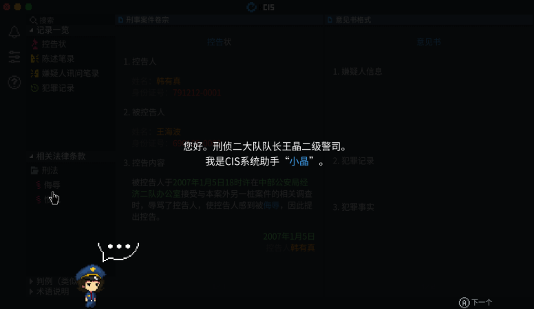 玩家操縱新人女性二級警司「清崎蒼」,閱讀涉及盜竊,謀殺等八樁案件的調查卷宗,並根據法律條款關鍵詞,在「地城」中的嫌疑人戰鬥,並將其提交給檢察官完成「意見書」。在玩家準備法律和先例等文件猶豫不決的時候CIS系統助手「小晶」將提供指引。此外,清崎蒼被設定了 HP,如果 HP 在地城中的戰鬥中變為零,或在時間限制的戰鬥中超時,將會迎來遊戲結束。