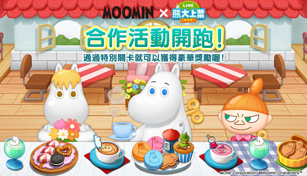 合作活動期間內「姆明」的角色們會在《LINE 熊大上菜》中登場!「姆明」、「姆明媽媽」、「姆明爸爸」、「小美」和「斯諾克小妞」將化身為夥伴來幫助大家過關!在期間限定的特別關卡中可以製作「姆明」等角色的可愛造型甜點喔,快來和「姆明」一起挑戰吧!