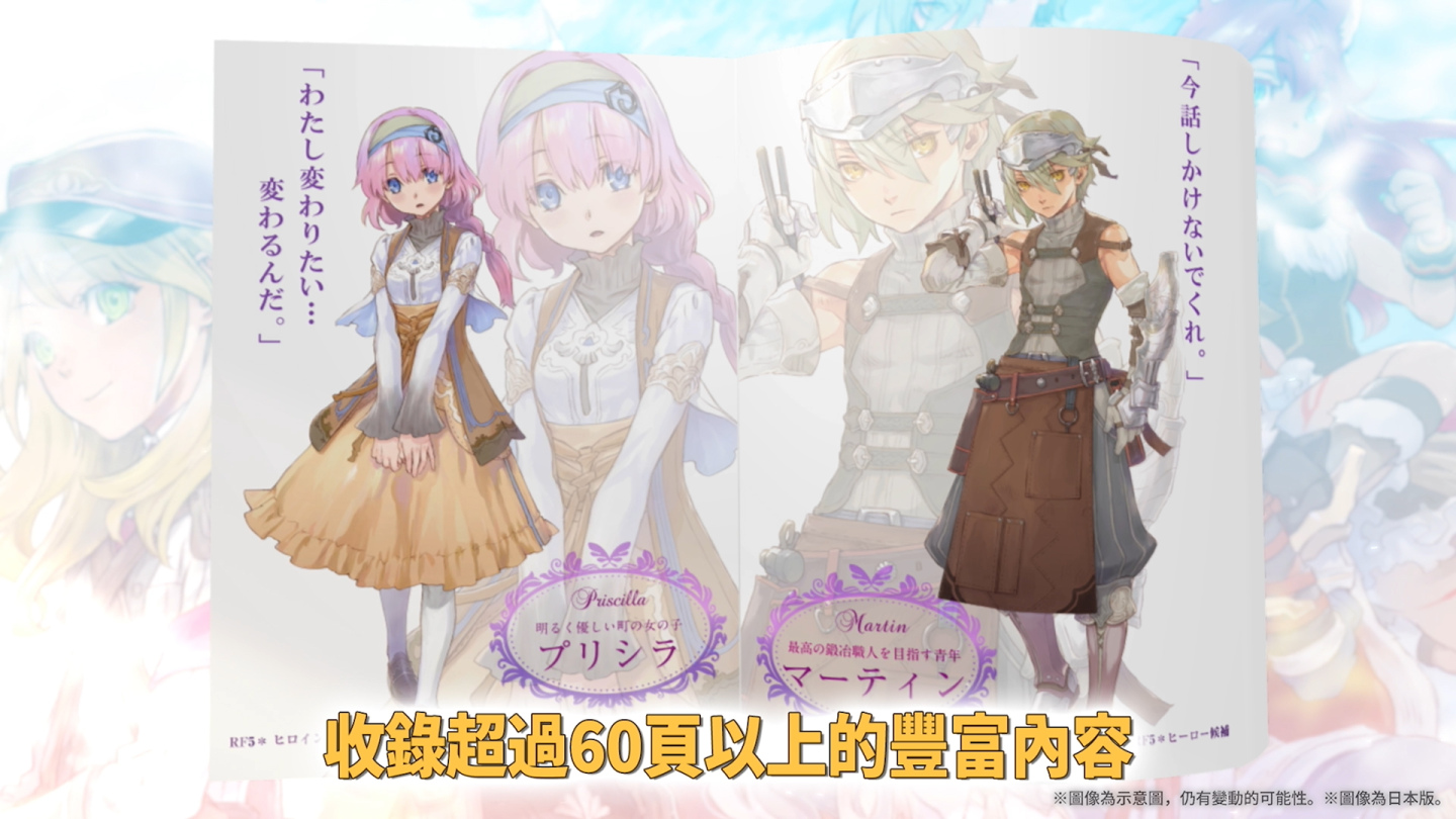 3、《符文工廠5》美術書:收錄了角色和美術背景等豐富內容,總頁數超過 60 頁,粉絲們絕對不能錯過。封面則使用了岩 崎美奈子繪製的全新插圖。文字內容有進行繁體中文化。