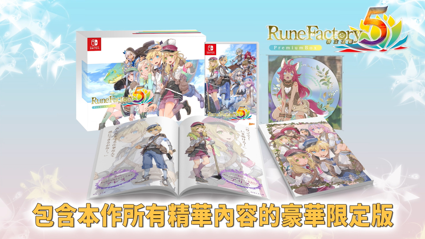Marvelous Inc. 所推出的人氣系列遊戲「符文工廠」最新作《符文工廠5》宣布將推出限定版。此外也公開了限定版「豪華套組」的介紹動畫,讓玩家們進一步了解滿載本作遊戲魅力、內含美術書與樂曲專輯等的限定版《符文工廠5 豪華套組》內容。本次也是亞洲版系列作首度推出限定版。《符文工廠5 豪華套組》為首批數量限定生產商品,敬請提早購買!