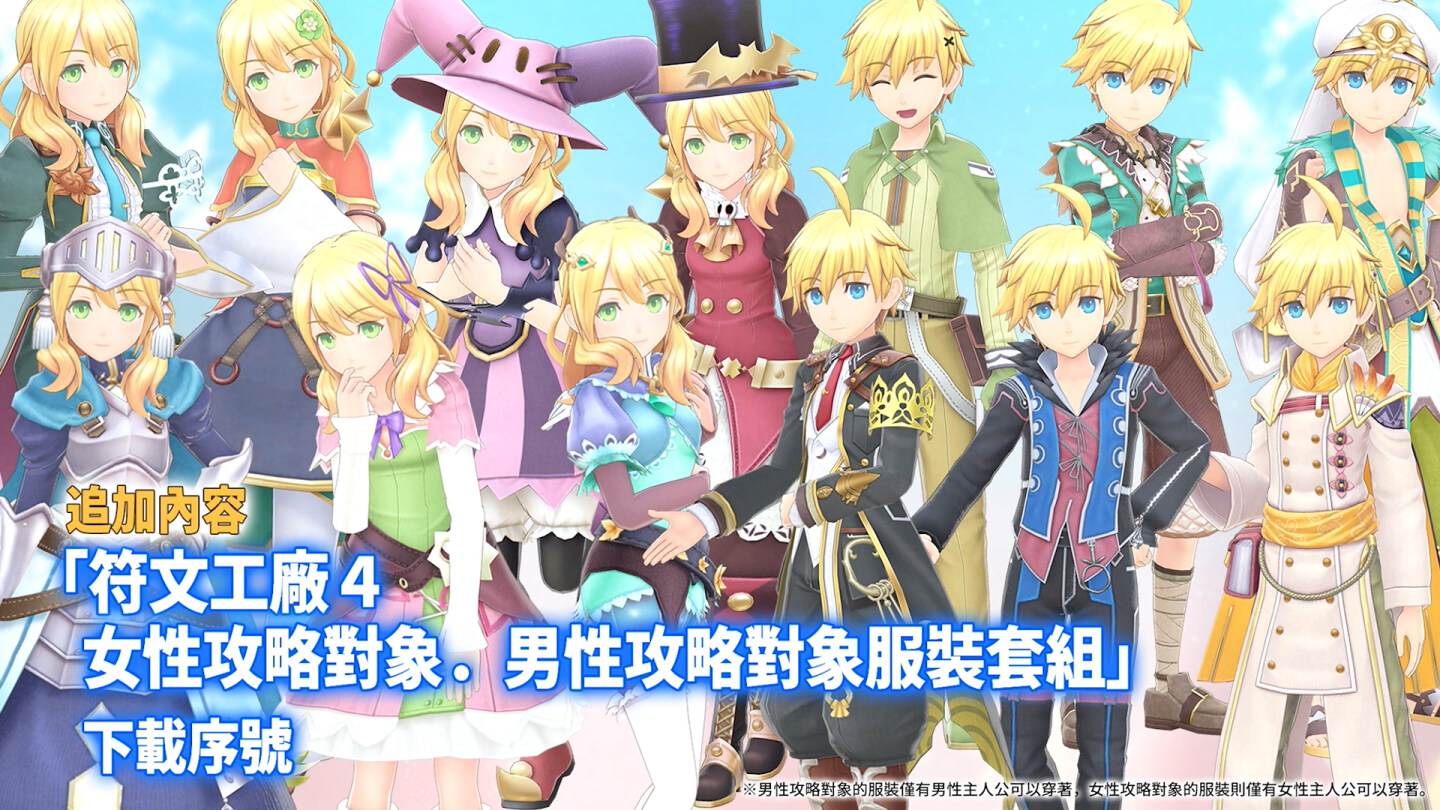 5、追加內容「符文工廠4 女性攻略對象.男性攻略對象服裝套組」下載碼:能夠獲得前作總共 13 名的女性攻略對象.男性攻略對象印象服裝的下載碼。