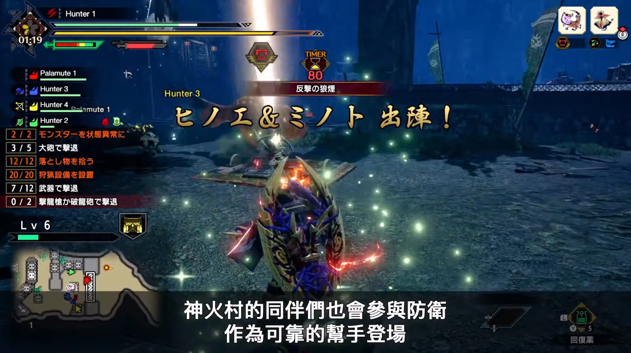 ※正式版將有體驗版不曾存在的新鐵蟲絲招式![]() ※五大原野區域:大社遺跡、水沒林、寒冷群島、沙原、熔岩洞 ※百鬼夜行:防守要塞戰,波狀魔物入侵,最後一波為首領魔物 ※準備時間可以設置狩獵設備※「反擊的狼煙」時段可以讓獵人親自上陣※神火村夥伴如水藝、火芽也會登場助陣 ※任務種類:單人村莊任務、多人集會所任務 ※多人任務難度:根據任務中參戰人數,新增三人難度,至此有一、二、三、四人難度的分野設計 ※獵人連結:公會系統,可以自行創介招待玩家進入※按讚:相互按讚的狩獵夥伴可以找到彼此的集會所大廳※具備攝影模式:由福福梟擔任,可以設定變焦、縮放等功能。 ![]() |
