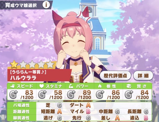 基於對春麗獨特的喜愛,該玩家將春麗從一星角升級到三星角取得決勝服裝、加上蒐集獎章提昇覺醒程度到 LV 3,多方嘗試可以繼承改變適性的馬娘,不知道經過多少次的培育過程,春麗在有馬賽事以第五名、第二名的結果前進著。