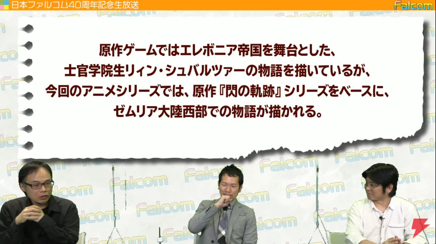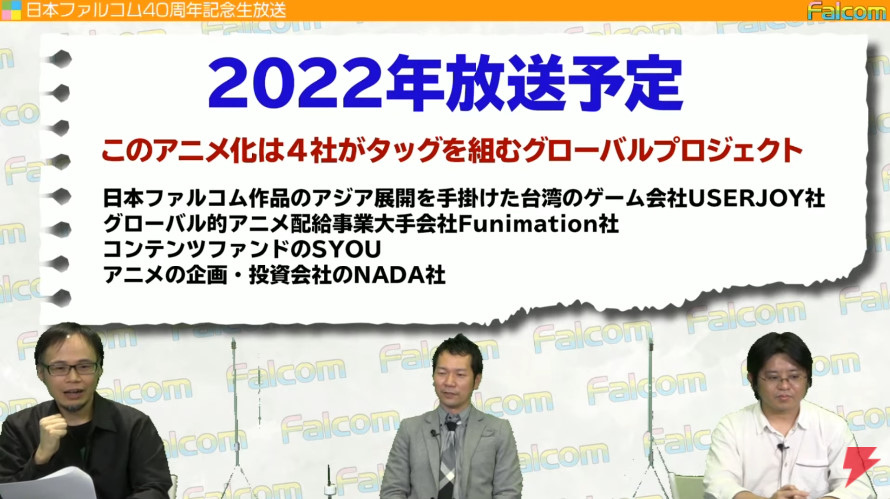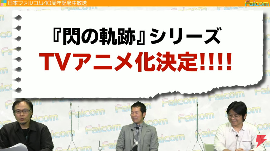 日本 Falcom 舉辦 40 周年紀念舉辦直播節目, Falcom 社長近藤季洋在節目中正式宣佈,《英雄傳說:閃之軌跡》系列將改編為電視動畫作品,預定 2022 年播出。將由 Falcom 與台灣的宇峻奧汀、全球動畫發行商 Funimation 等內容創投企業攜手以全球化專案製作。