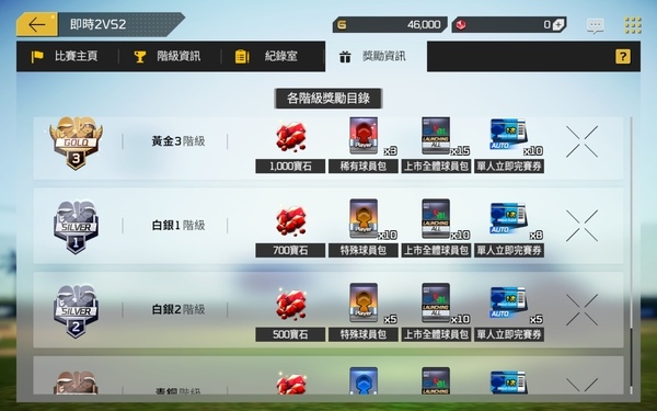 本次更新後,玩家可暢玩即時對戰系統「即時比賽2VS2正規賽」。正規賽版本加入排位階級,每周一成績結算後依照玩家達成的階級,將可獲得寶石、球員包等好禮。