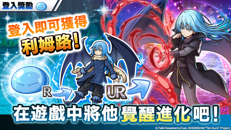 登入遊戲即可獲得合作活動復刻角色「[轉生]利姆路‧坦派斯特」,不但能以強化素材來強化利姆路,本次活動還開放了讓利姆路覺醒為「[魔王]利姆路‧坦派斯特」的功能!