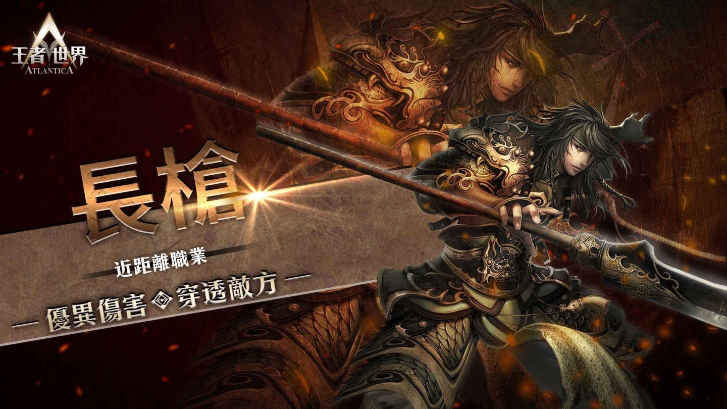 擁有高攻擊力之外,仍有不俗防禦力的職業「長槍」,因攻擊範圍廣,多數擔任前排的主要攻擊手。在進行對戰時,攻擊範圍可達兩格,輸出不僅貫穿敵方前排坦克,更可直接對後排角色造成傷害。主角特性將可增加全隊的命中、連擊、與爆擊率。若想追求高傷害輸出,長槍絕對是最適合的選擇!施放「戰力爆發」技能時,可以燃燒自身強大的戰意,短時間內大幅度提升自己的能力值,對敵人造成加倍傷害。
