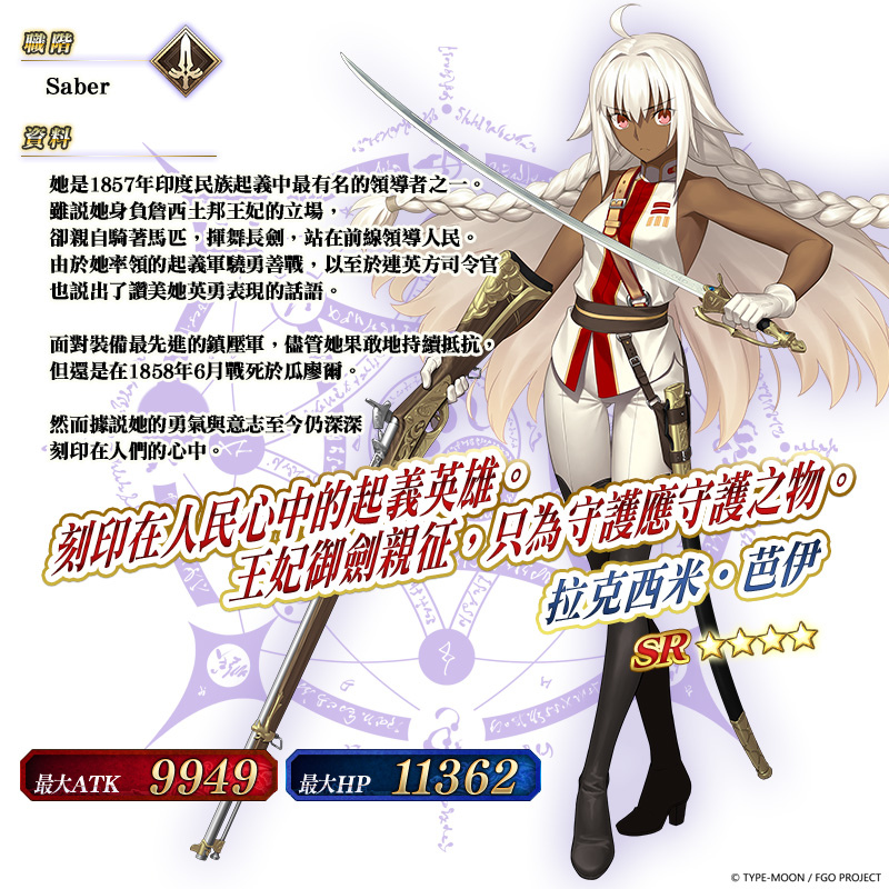 揮舞著長劍,在印度民族起義的前線領導人民,即使面對裝備先進的鎮壓軍,仍果敢地持續抵抗。以Saber職階現身,透過寶具「不容侵奪之拒絕王國」的施展,在使敵方全體爆擊率下降、被解除攻擊強化狀態的同時,將對敵方全體發動強大的攻擊。