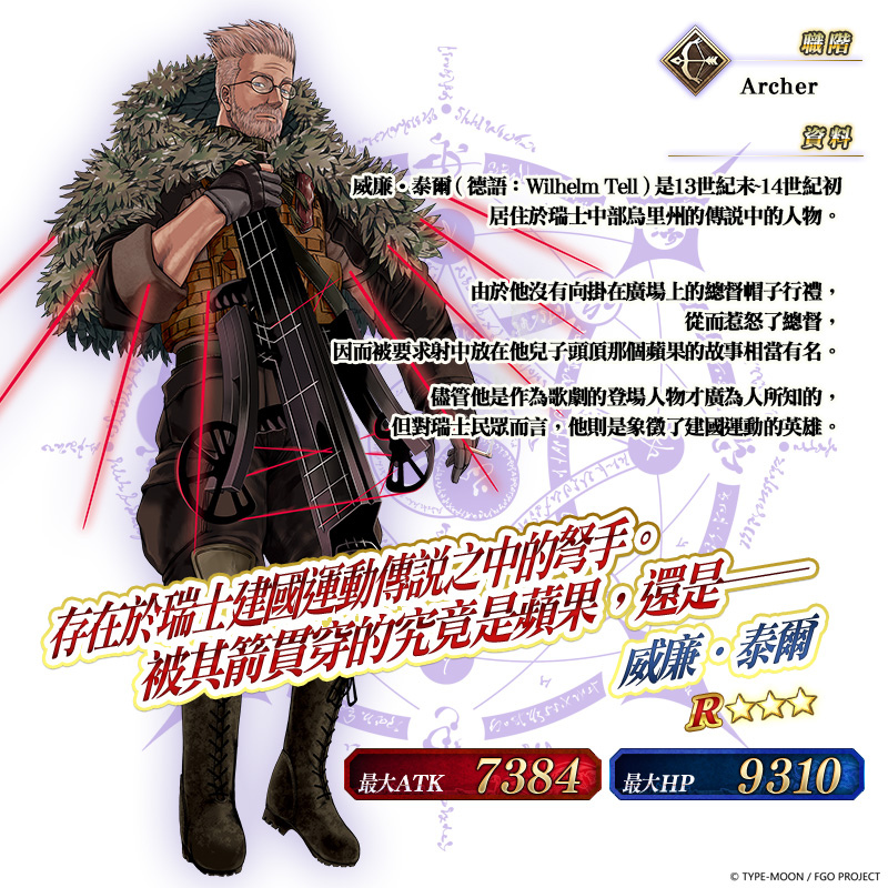 象徵著瑞士建國運動的英雄,作為弩手亦是傳說的存在。以Archer職階現身,透過寶具「射出信念的一箭」施展,將對敵方單體發動超強大〔迴避狀態(除無法解除的狀態)〕特攻攻擊,並賦予自身必中狀態。