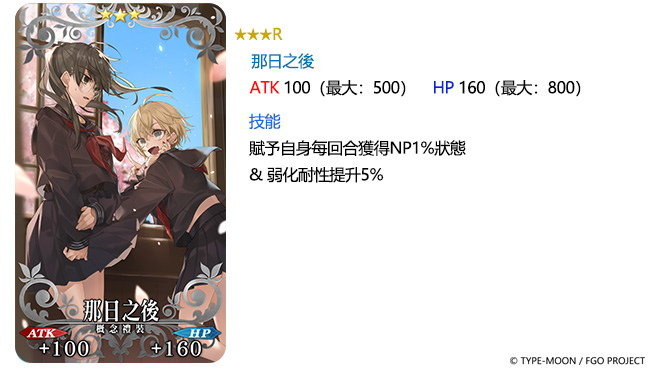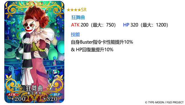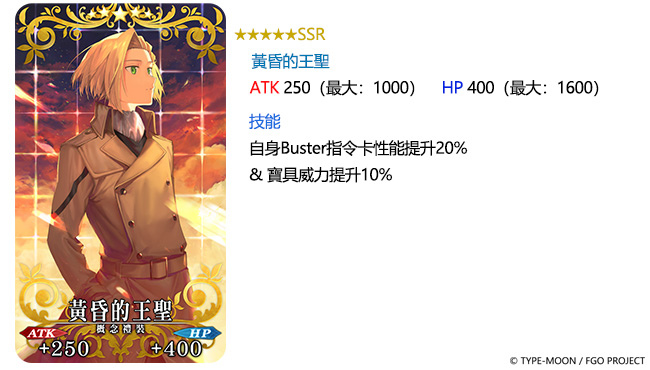 自本次 PICK UP 召喚起,開放的三款全新概念禮裝,御主們裝備通關任務時,運用禮裝賦予的附加效果搭配,可以讓戰鬥更加得心應手。分別是提升自身Buster指令卡性能20%的「★5(SSR)黃昏的王聖」、提升HP回復量10%的「★4(SR)狂舞曲」及提升弱化耐性5%的「★3(R)那日之後」。