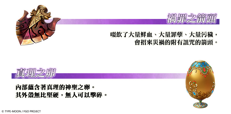 而通關第 2 部第 4 章主線任務的過程中,透過機率獲得的「禍罪之箭頭」及「真理之卵」等兩種全新素材,可以運用在新登場的從者們上,無論是技能強化,或是靈基再臨,提升從者戰鬥力的同時,御主自身的實力也將同步提升。