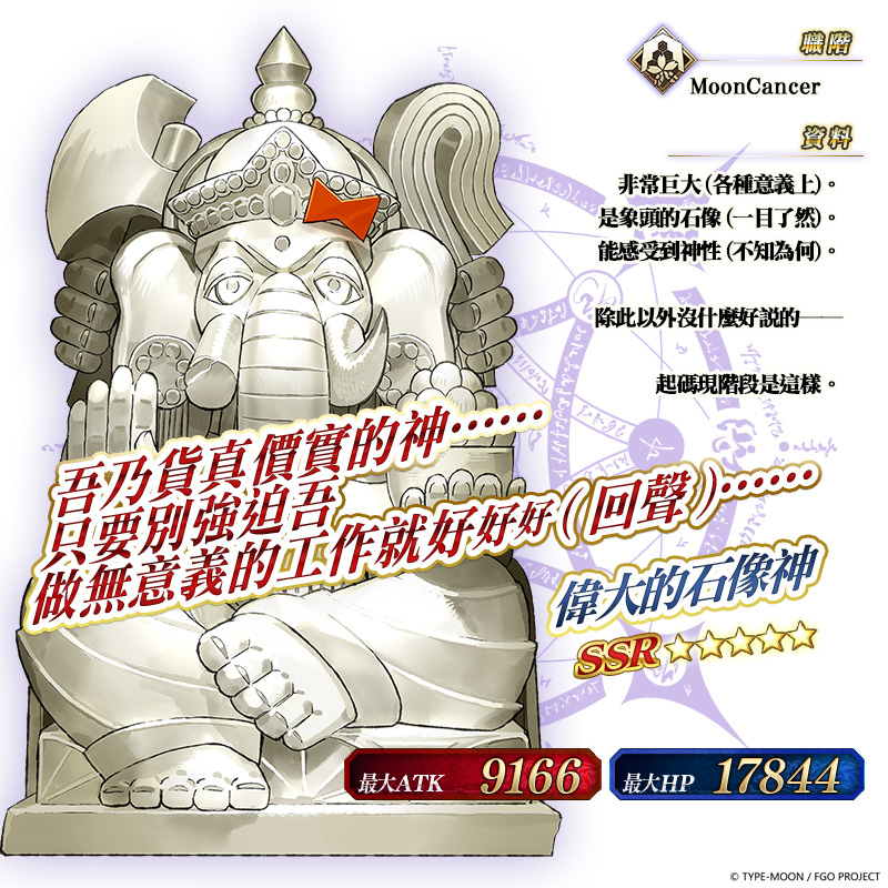 用非常巨大的象頭石像,化作實質的現世存在,擁有貨真價實的神性。以MoonCancer職階現身,透過寶具「肉彈啊,明天再開始努力吧」的施展,將使敵方全體防禦力下降、並對其發動強大的攻擊,同時賦予自身無敵狀態及回復HP。
