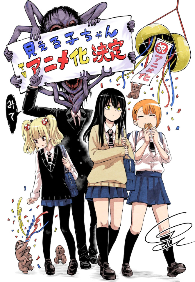 泉朝樹《陰陽眼見子(見える子ちゃん)》確定改編電視動畫,預計今年內播出。本作描述女高中生見子某天突然看得見那些「恐怖的東西」而展開的日常生活,目前正在 ComicWalker 上連載,最新單行本第五集將在 3/22 於日本上市。因應動畫化消息,泉朝樹老師也特地畫了感謝賀圖。