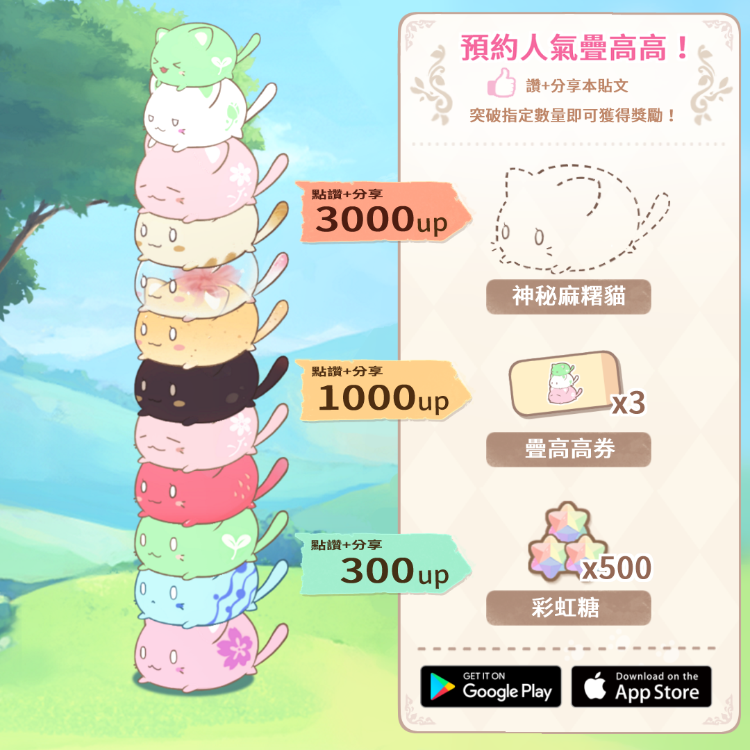 目前於官方粉絲團舉行「預約人氣疊高高」活動,參與按讚+分享突破指定數量,即可在正式上線時獲得各式獎勵,其中最高獎項是目前未曾公開過的「神秘麻糬貓」。