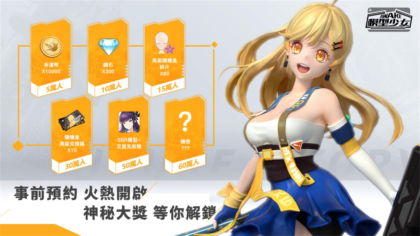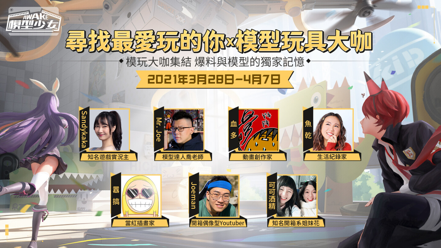 《模型少女AWAKE》截至今(26)日,事前預約人數成功突破 30 萬人,解鎖了新一階段的獎勵。歡慶突破 30 萬預約,官方首度公開「模玩大咖」消息,預告將邀請多位知名 Youtuber,如:Sandy、Mr.Joe、血多、魚乾、囂搞、Joeman、可可酒精等七位喜愛模玩的嘉賓參與「尋找最愛玩的你」模玩主題有獎徵集活動,更有「雨夜噩夢」玩法介紹以及繁中獨佔聯動情報釋出!