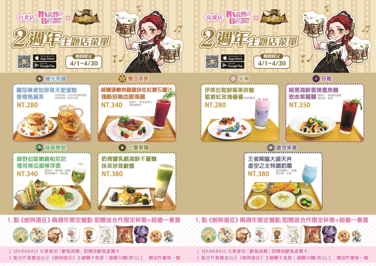 光顧 KIRABASE 台北店的冒險者,可以品嘗四道主廚為《劍與遠征》獨家設計的精緻餐點,分別為耀光帝國、蠻血部族、綠裔聯盟、亡靈軍團套餐。前往高雄店的朋友,則有半神、惡魔、虛空來客任君選擇。除此之外套餐內還附贈虛寶好禮,並加碼遊玩刺激的一番賞活動,贏得美術設定集、英雄抱枕、立體滑鼠墊等諸多遊戲周邊,各位幸運的冒險者們快來挑戰吧!