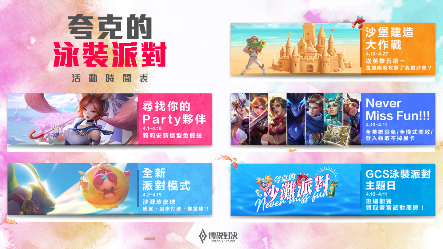 另一方面,本次系列活動中也推出卡片蒐集活動,在活動期間內每日登入簽到及完成任務,即可獲得卡片抽取機會,集滿活動中的12張卡片,將可免費領取「莉莉安 海魂之風」造型。此外,小遊戲「沙堡建造大作戰」將於 4 月 10 日開啟,玩家成功完成任務後即能免費獲得英雄五選一獎勵。週末更有全英雄限免及全模式開啟活動,讓玩家於盡情暢玩《傳說對決》。