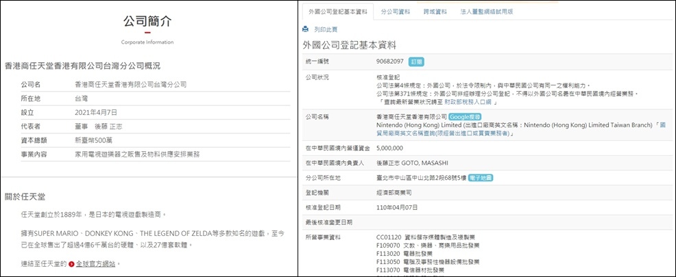 在台灣經濟部商業司所提供的查詢服務中,也可以看到香港商任天堂香港有限公司在台設立的相關資訊,設立時間、負責人資料都與任天堂台灣官網資訊一致。