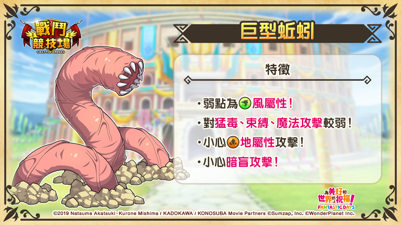 4 月 15 日(四)12:00~4 月 22 日(四)11:59 期間將舉辦特選戰鬥競技場。本次的頭目為地屬性的巨型蚯蚓,弱點為風屬性。除此之外,本次的競技場獎勵將提升為 3 倍!各位玩家請準備好風屬性武器挑戰特選戰鬥競技場,入手大量競技場獎牌,把握這次機會交換想要的素材吧!