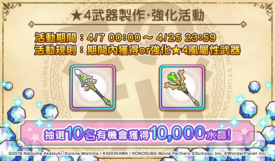 ★4風屬性製作・強化活動自 2021 年 4 月 7 日(三)00:00起至 4 月 25 日(日)23:59 為止。活動期間內只要獲得或強化★4 風屬性武器,將抽選 10 名贈送 10,000 水晶!能夠獲得大量水晶的大好機會,歡迎各位踴躍參加。活動詳情請至Facebook官方粉絲團確認。