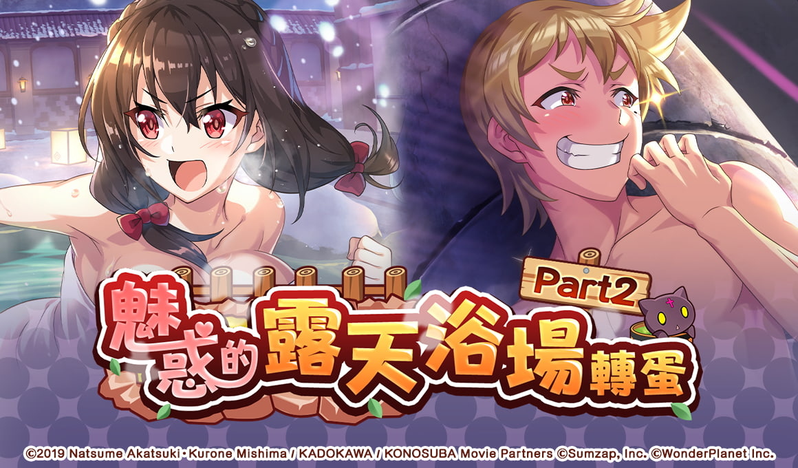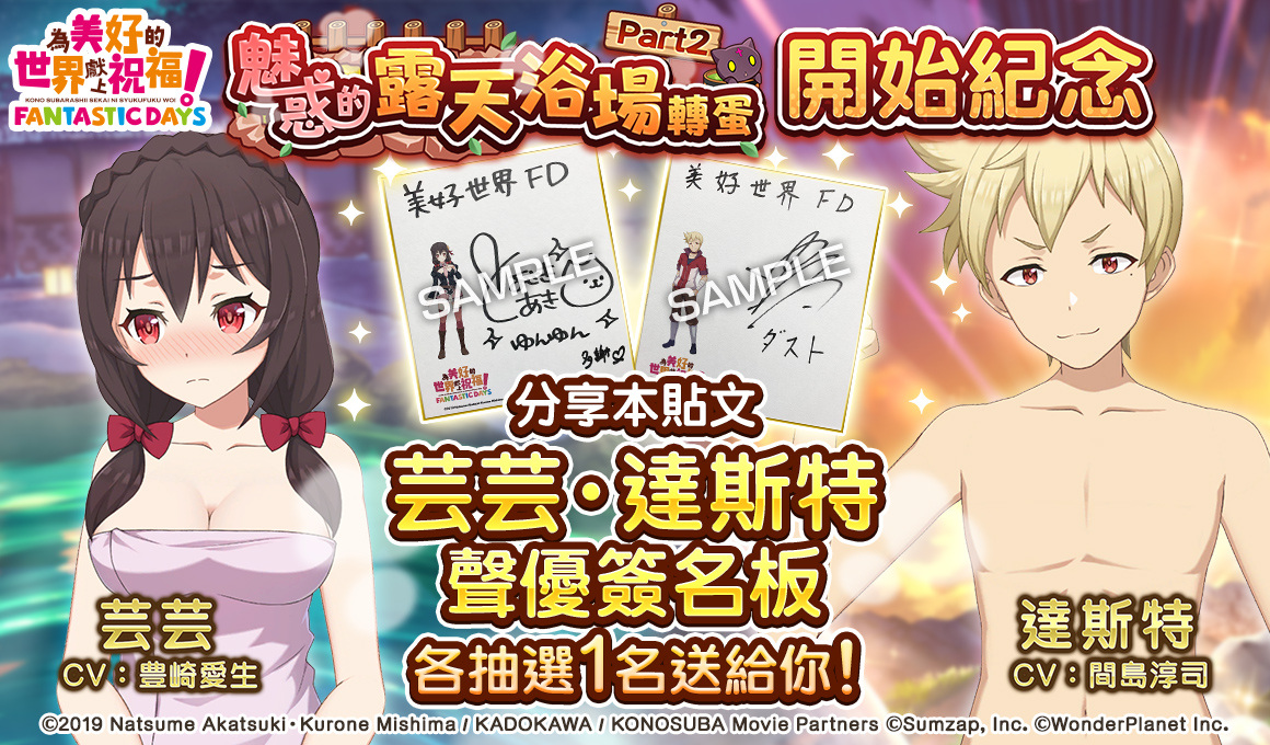 為紀念「魅惑的露天浴場轉蛋Part2」開始,將舉辦 Facebook 官方粉絲團限定聲優簽名版抽獎活動。將從參加本活動的玩家中抽選,分別送出芸芸和達斯特的聲優簽名版!活動詳情將在日後公布於Facebook官方粉絲團,千萬不要錯過!